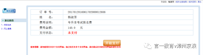1、点击网上缴费,界面显示订单号、姓名、费用说明、费用金额以及支付状态,点击【开始支付】