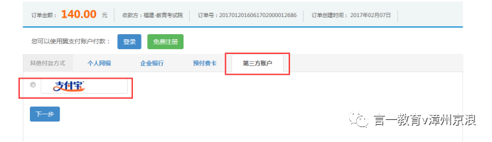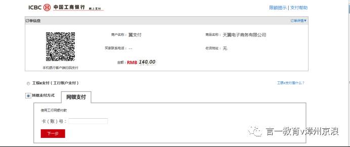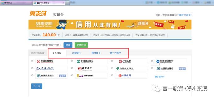 2、开始支付后,界面会跳转到翼支付平台,选择付款方式(注意:不需要注册或者登录翼支付账号,直接选择个人网银或者第三方账户支付宝进行付款)