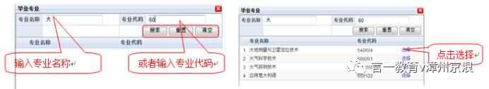 毕业专业选择,填写专业名称/专业代码→点击“搜索”按钮→毕业专业,点击“选择”按钮,即可;可以点击“重置”按钮进行重置,再进行选择检索操作;可以进行清空数据,然后重新选择检索操作。