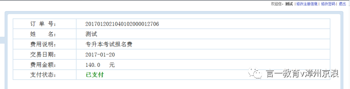 3、付款成功后回到考生中心界面,点击支付完成,此时支付状态变更为已支付,如图。