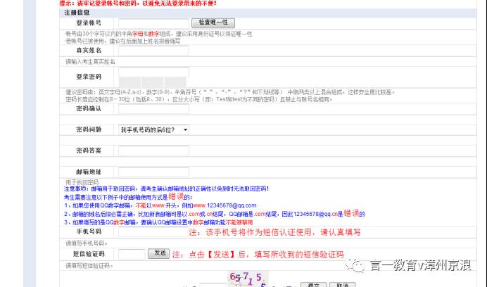 4、手机号码是作为短信认证使用,注册界面的手机号以及短信验证码需与手机接收到的验证码、手机号匹配才能注册成功,否则注册不成功。并且考生在预报名期间在网站上有作任何修改,都会通过该手机号发送考生修改提示短信。