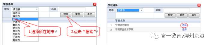 毕业院校选择,选择所在城市/填写学校名称→点击“搜索”按钮→学校选择,点击“选择”按钮,即可;若选错城市可以点击“重置”按钮进行重置,再进行选择检索操作;可以进行清空数据,然后重新选择检索操作。