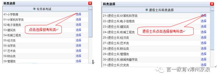 选择报考科类,根据报名用户类别进行区分,左图为普通考生报考科目;右图为退役士兵报考科类,相应科目,点击“选择”操作即可